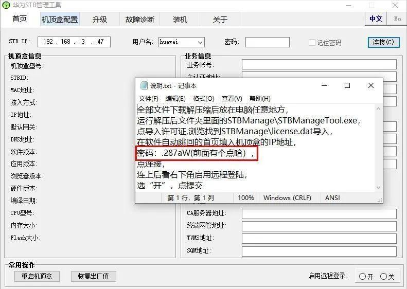 打开华为STB管理工具,按照上图说明里的步骤输入信息,IP地址要输入前面看到的机顶盒无线获取的IP,输入完成后点击连接。