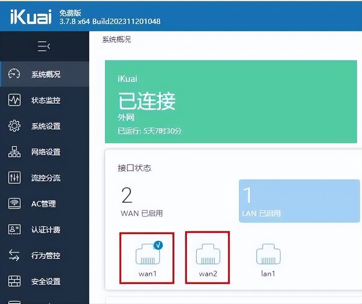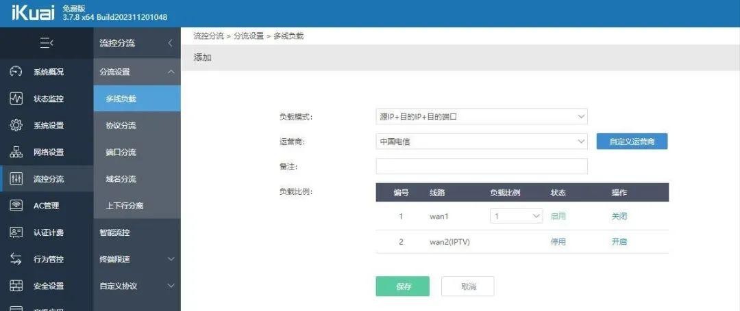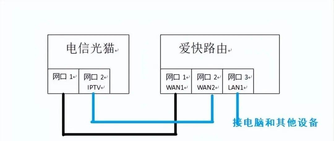 如果你能拿到光猫的超密(河北电信 超密是: telecomadmin nE7jA%5m ),修改光猫网口的业务绑定也可以实现单线复用,一根网线就可以实现。我路由器网口多,所以今天只讲双网线实现方式。首先给爱快路由器添加两个WAN口和一个LAN口。路由器的WAN1接光猫网口1,实现上网功能。将路由WAN2接光猫IPTV口,一般是网口2。