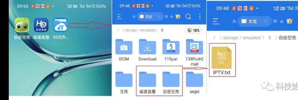 以手机为例,在手机上安装自由空壳和ES文件管理器,打开自由空壳后退出,进入ES文件管理器,找到自由空壳文件夹,然后把修改好的直播源放进去,这样就可以直接用手机看电视了。同样的操作也可以在盒子、平板上实现。