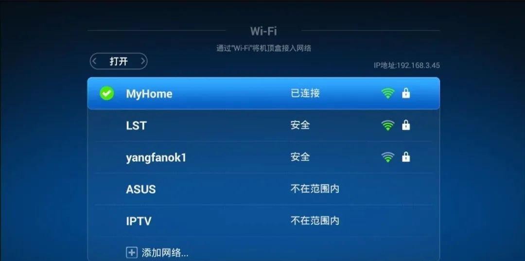 找到盒子的设置,用无线wifi连接家里的无线路由器。如果无法连接,就拔掉网线再试试。无线连接成功后,记住右上角的IP地址,咱们后面要用。