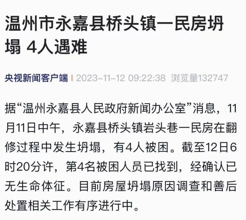 温州市发生了一起令人痛心的民房坍塌事故,造成4名无辜的生命丧生。