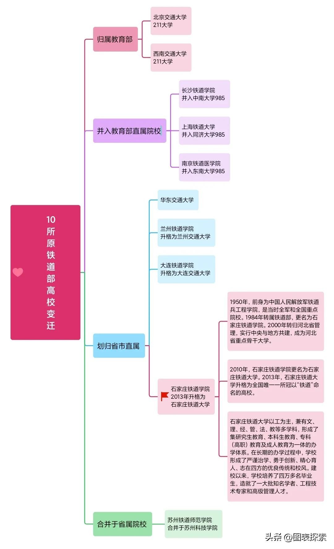 当年的铁道部共有10所直属院校,其中长沙铁道学院,上海铁道大学,南京铁道医学院,苏州铁道师范学院参与其他高校合并,番号消失。虽然这4所高校丧失了独立发展的道路,但大多数都有一个好的结局,前三者都有了985大学的身份。