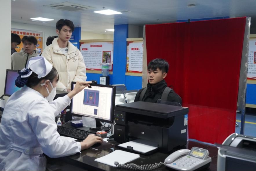 在县人民医院体检现场,参检适龄大学生逐一进行内科、外科、耳鼻咽喉科、眼科、口腔科、辅助检查(心电图、胸透、彩超、检验)以及士兵职业基本适应性检测等项目的全面体检。