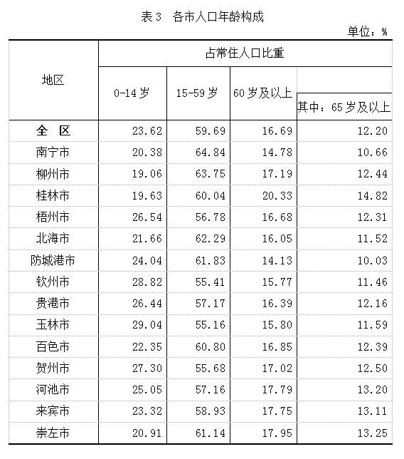 在南宁市常住人口中,0—14岁占常住人口比重为23.38%,15—59岁占常住人口比重最大、为64.84%,60岁及以上占常住人口比重为14.78%,其中:65岁及以上占常住人口比重为10.66%。