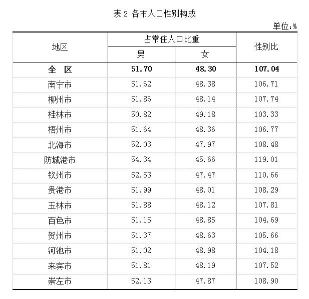 在南宁市常住人口中,男性人口占常住人口比重51.62%,女性人口占常住人口比重为48.38%,总人口性别比为106.71。