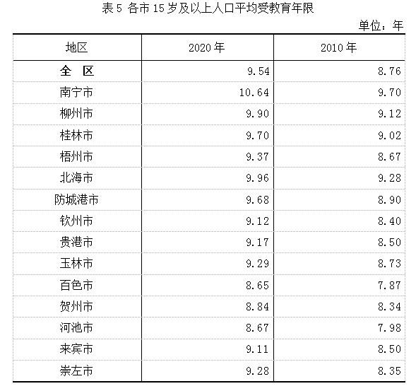 与2010年第六次全国人口普查相比,南宁市常住人口中,15岁及以上人口的平均受教育年限由9.70年提高至10.64年。