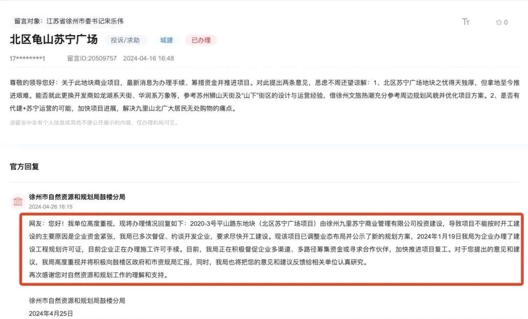 而远在徐州,龟山苏宁广场的未来也因此变得扑朔迷离。去年4月,有网友在市长留言板焦急询问其动态,徐州市自然资源和规划局鼓楼分局彼时回复,企业正在办理施工许可手续,官方也在积极助力企业筹集资金、寻觅合作伙伴,全力推进项目复工。