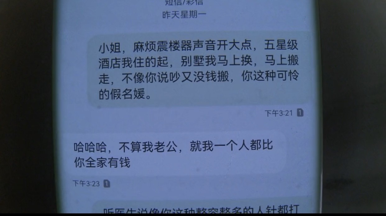 甚至短信中还含有诅咒楼下住户的内容,声称整容针打多了对孩子不好,要多多保重。