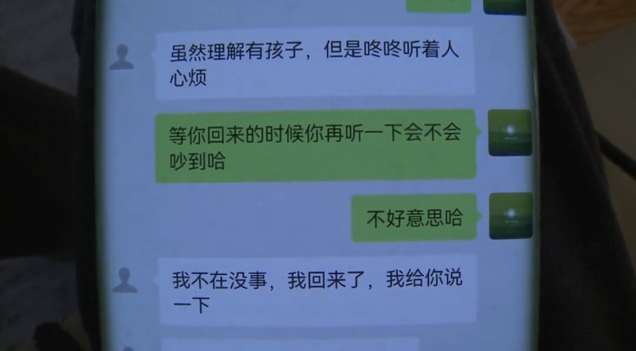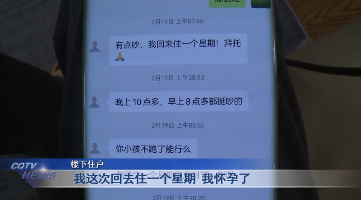 质问林女士一家孩子多大了,跑了一早上了,到中午还一直在楼上跑跳,并且专门录了视频发给林女士,同时表明自己怀孕心情不大好,不能忍受这么持续的噪音。