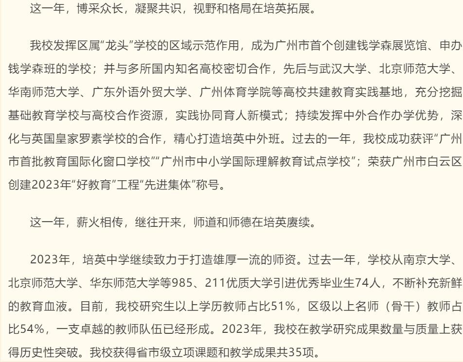 从前天(1月7日)新鲜出炉的《培英之路,步步生花|广州市培英中学2023年度总结》中,我确实看到了不少积极的信号。