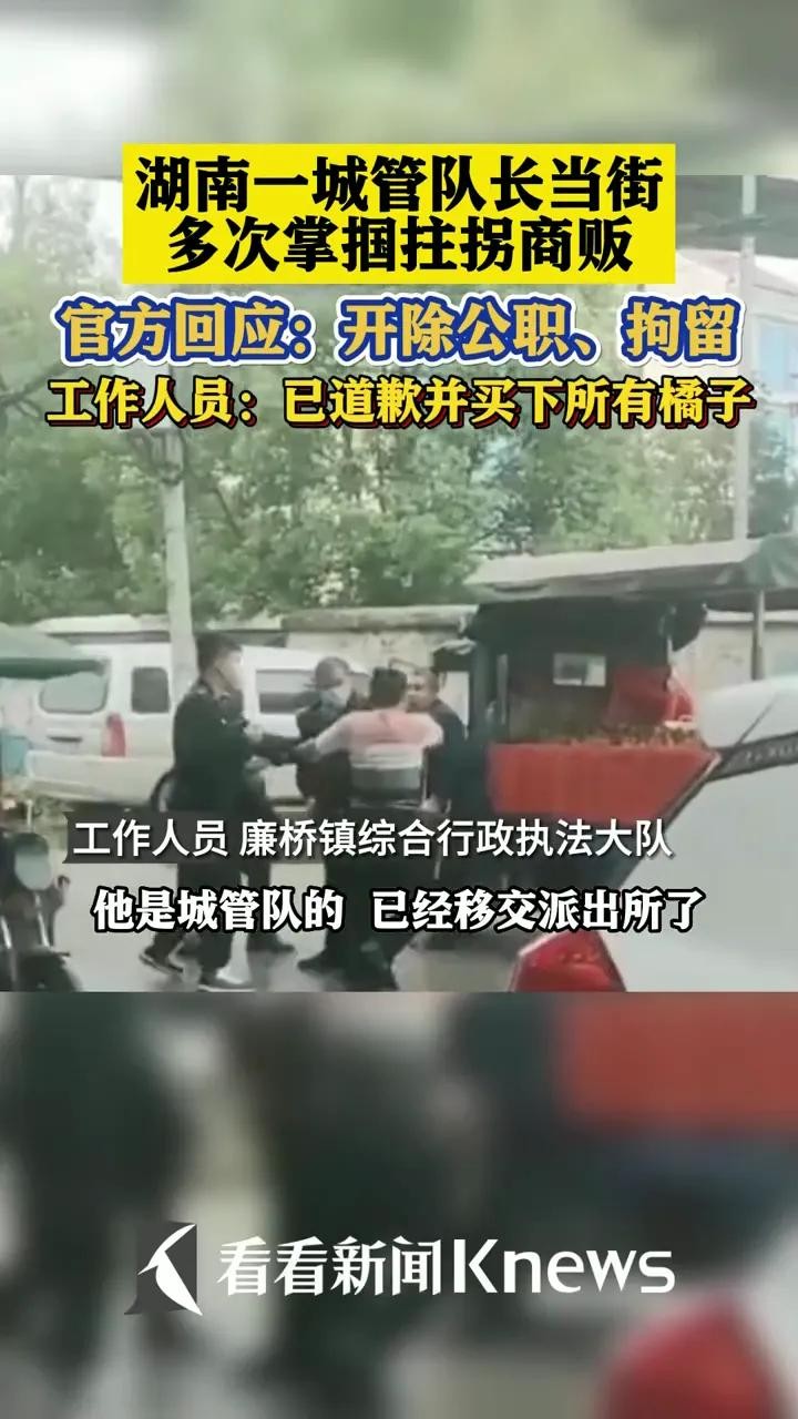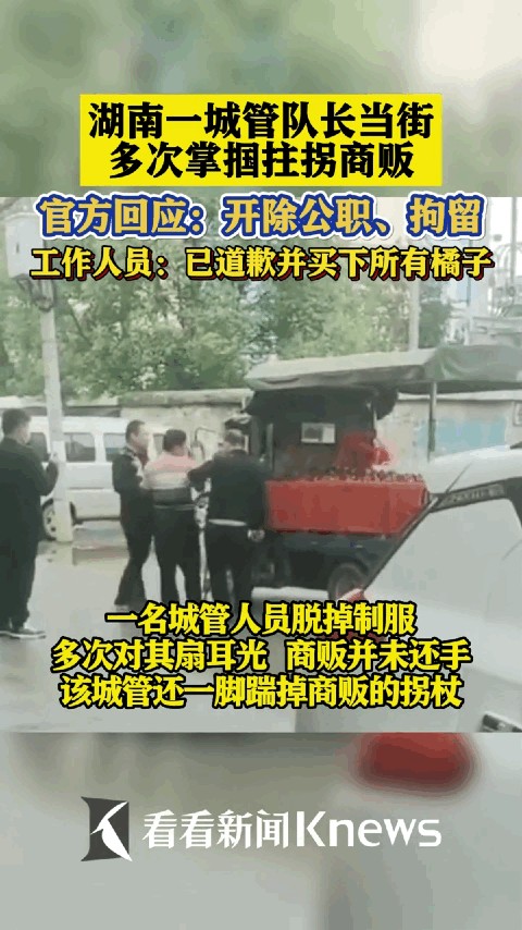第2起:11月28日,湖南邵东市廉桥镇综合行政执法大队城管队长带人在街上开展环境卫生执法,期间发现一名拄着双拐的残疾人开车在路上售卖橘子。因对方系占道经营,城管队长对其进行劝阻,摊贩不愿意配合,并对城管队长进行辱骂。
