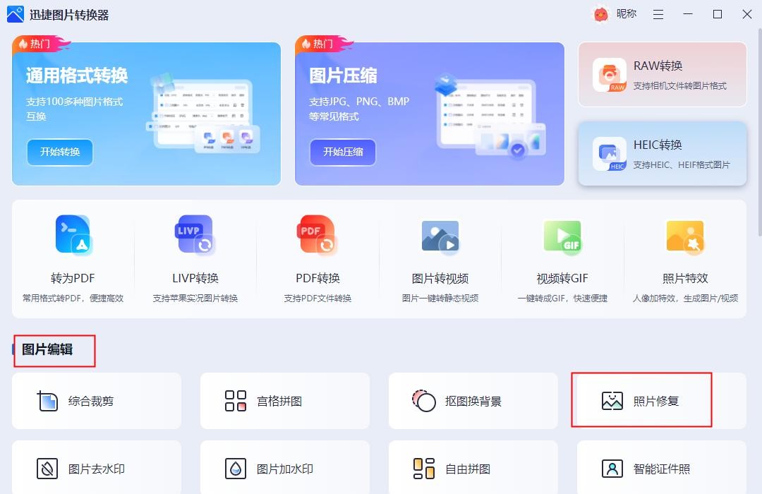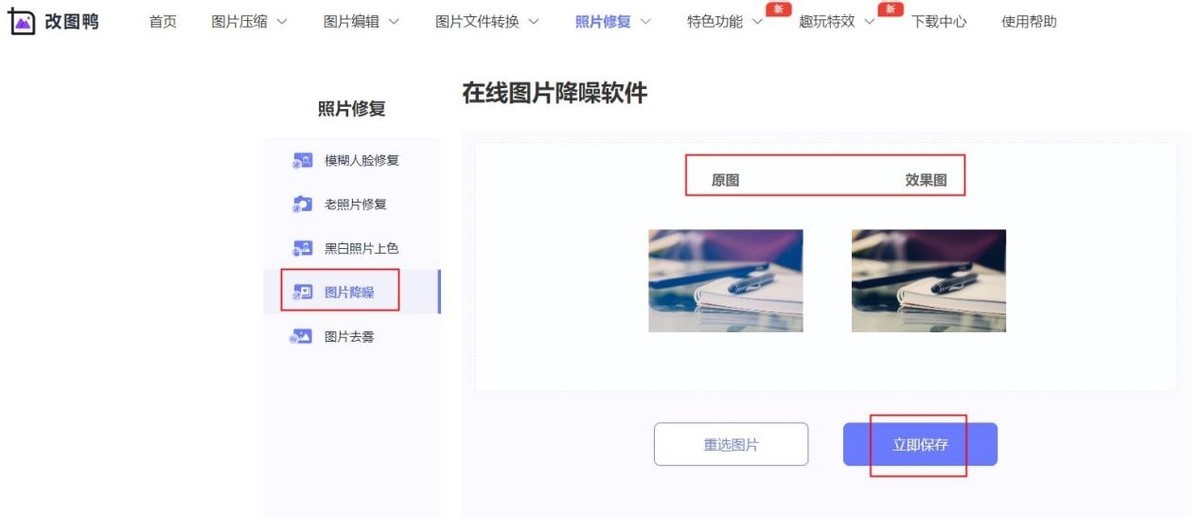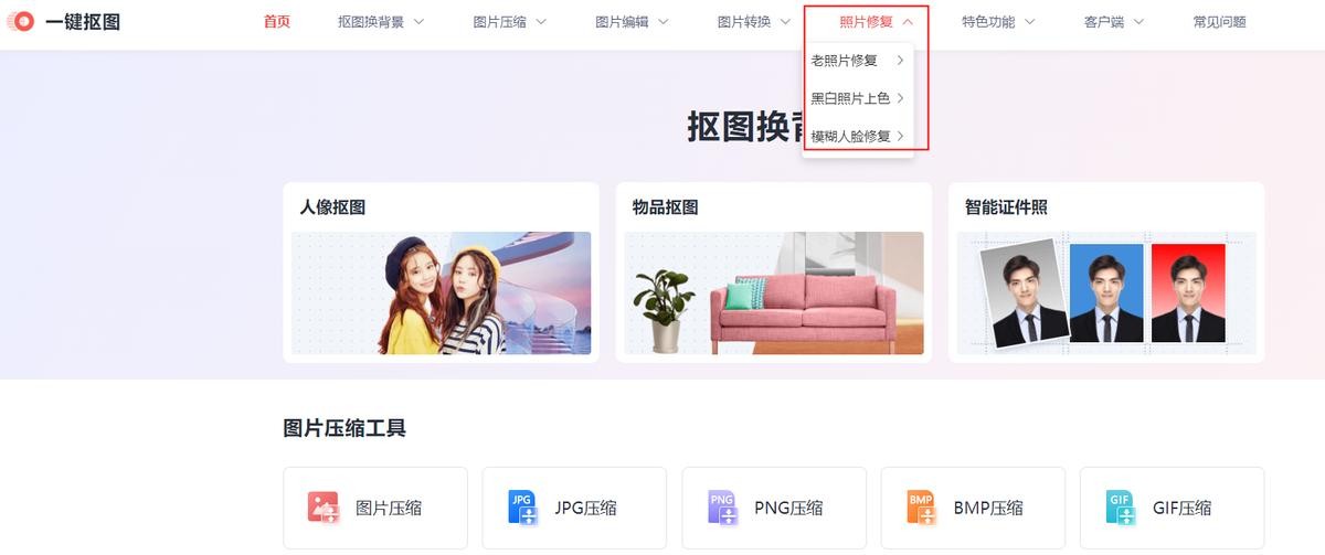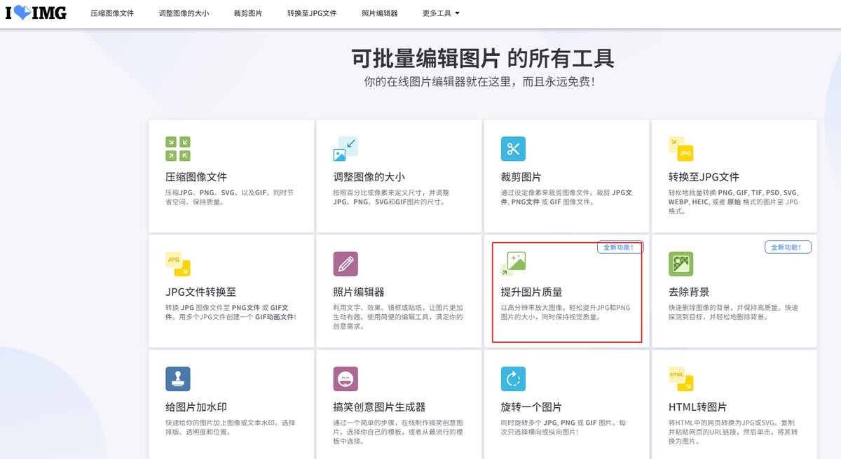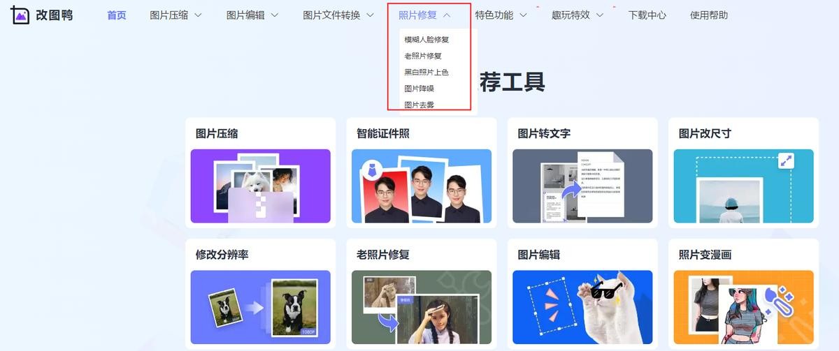 同名网站也很推荐用,涵盖图片编辑、图片压缩、格式转换、趣玩特效等6大核心功能。其中的【照片修复】也同样分为5种类型,选中后添加图片即可。