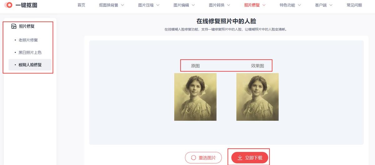 【照片修复】分为老照片修复、黑白照片上色和模糊人脸修复这3种,根据需求来选择,然后上传单张图片,原图和效果图能一起查看,满意的话就能下载导出。