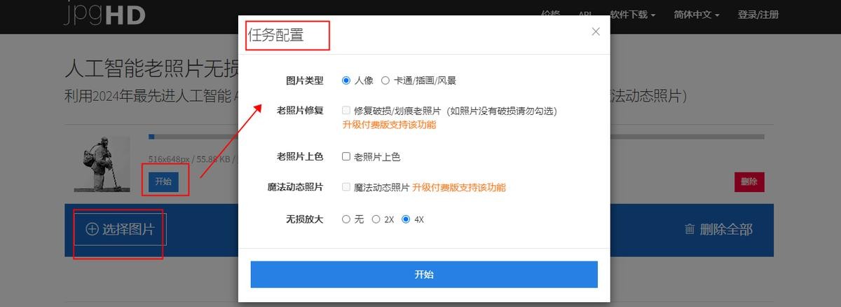 先选择单或多张图片添加,接着点击图片下方的“开始”,在弹出的“任务配置”窗口选择图片类型后选择所需的修复方式,静待处理完成即可下载查看。