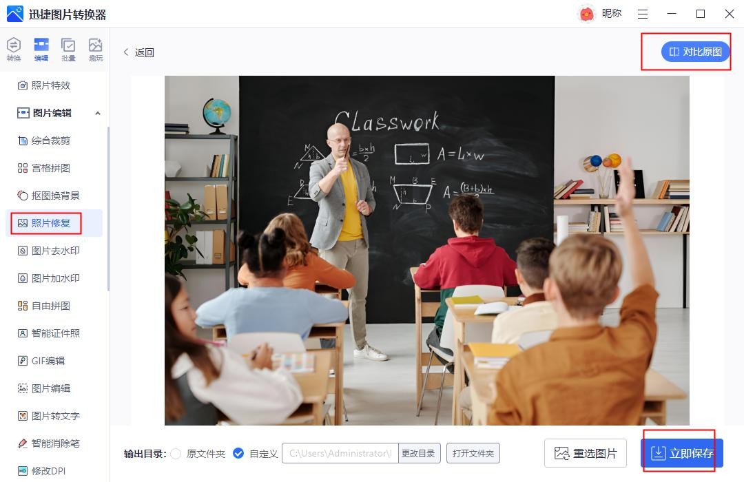 打开后点击左侧的“照片修复”,细分为5种类型,按需选中后添加单张图片便会自动处理,效果预览图会直接展示,也可切换原图比较,立即保存就能导出。