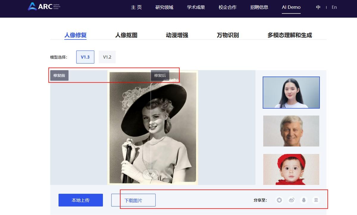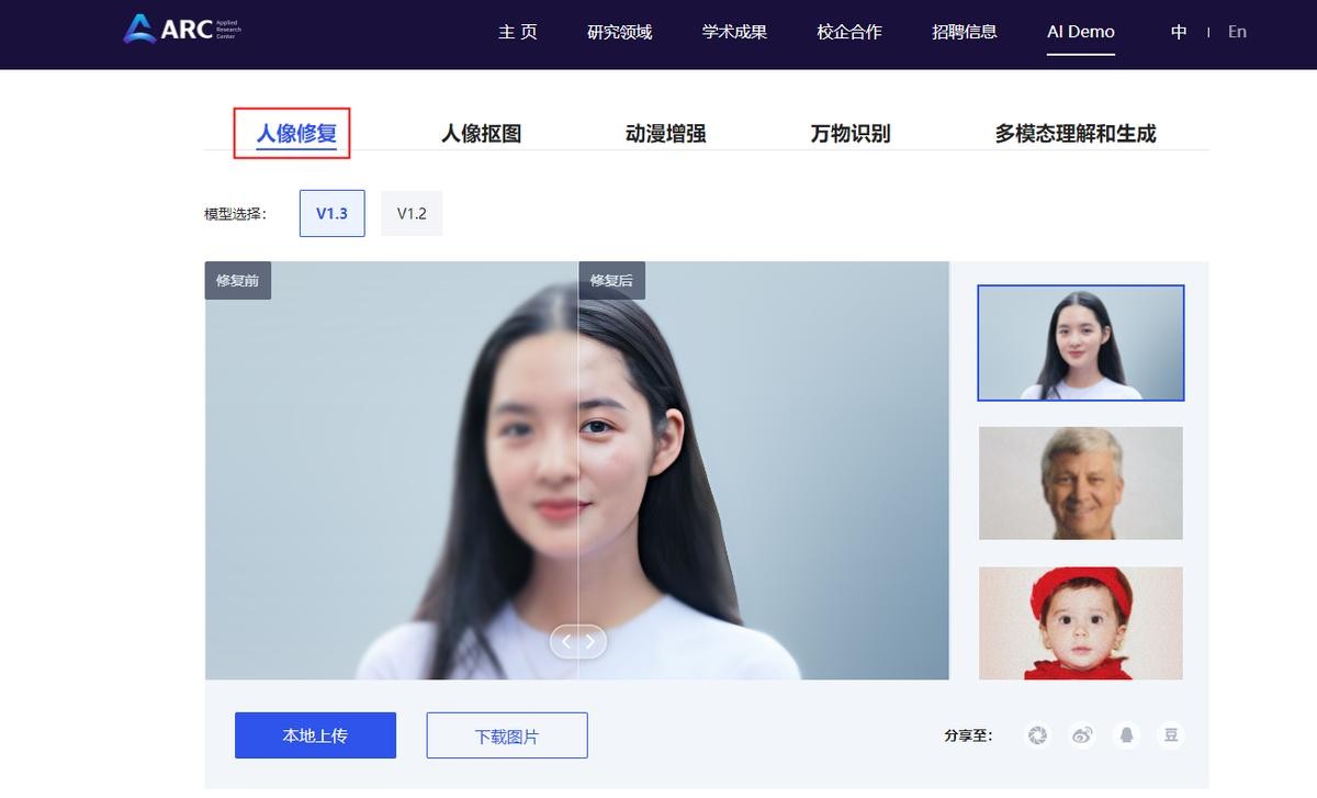 打开后点击“AI Demo”选择【人像修复】,内置两种模型,本地上传图片后会自动开始处理,能在原图上直接对比修复前后的效果,还支持下载和分享。