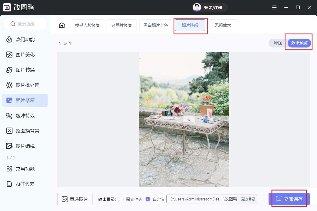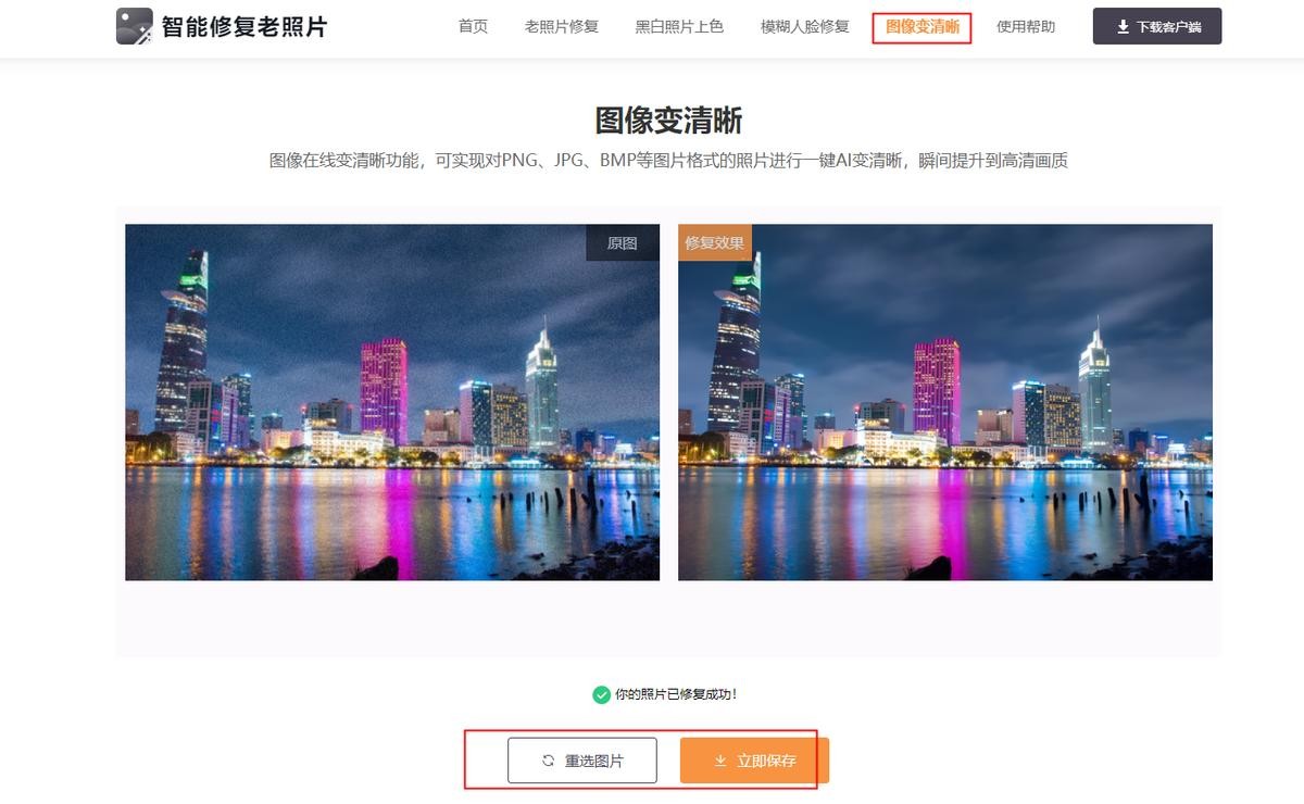 上传好后会自动进行对应处理,完成后会同时展示原图和效果图,点击“立即保存”就能下载导出,无论是人像或风景照片都适用,有效提升图像质量!