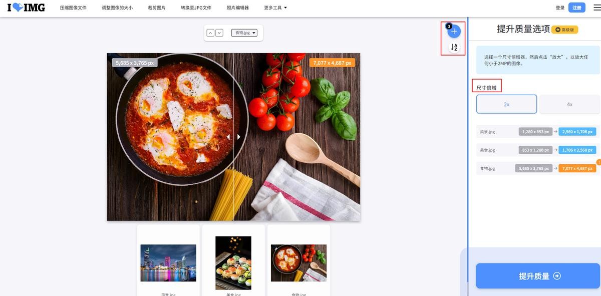 先点击【提升图片质量】,一次至多上传3张,支持按名称排序,然后选择尺寸倍增比例,会一并显示前后的分辨率,拖动就能查看效果,完成即可下载。