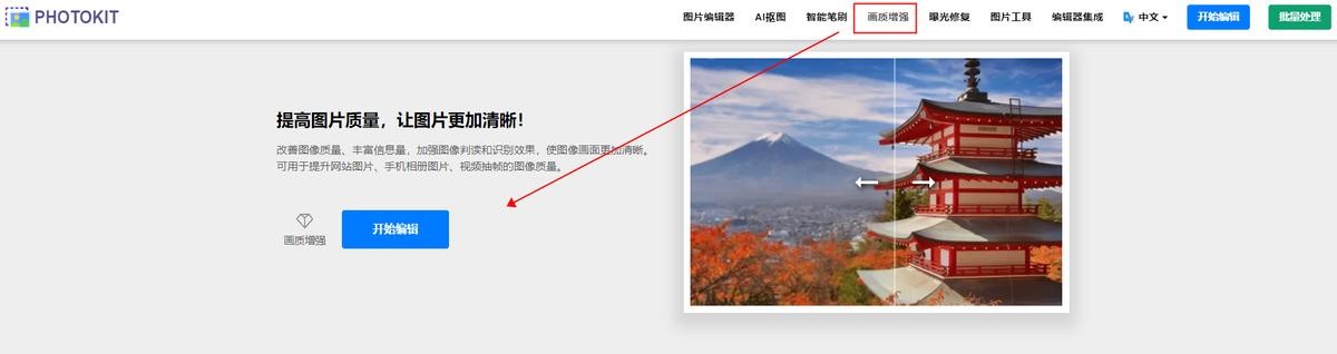 先点击顶部的“画质增强”,接着选择“开始编辑”导入单张图片,分为人工智能画质增强和图像普通锐化增强这2种方式,自动处理完成后支持复制和保存。