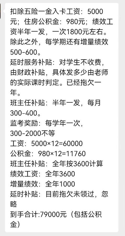 每月工资到手5000元;公积金980元;绩效半年一发1800元;班主任补贴350元;增量绩效:全年1000元。