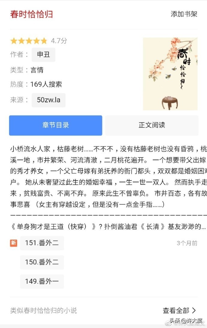 三、【古代言情-平凡生活文】《春时恰恰归》(著)「大度说」这是一个秀才娘子与衙役的故事。整体氛围温馨,平凡。没有突然变得很有钱,很有地位,也没有诉说男女主角一辈子到老。从结婚到生孩子,从府衙到家里,从一些家庭琐碎、邻里邻居、婆媳关系、亲朋好友等诉说了一些事情。人生说短不短,一百多章就已经发生了那么多事情。说长不长,一百多章才仅仅是生活了几个春秋冬夏。文中对话都带有古代味道,细水流长式的表达。{古代生活、家长里短、人情往来、生活琐碎}