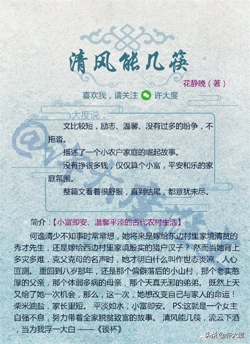 二、【古代言情-重生种田文】《清风能几筷》花静晚(著)「大度说」又发现了新类型文——种田文中的重生文。{励志、奋斗、重生、爱情}男女主角爱情温馨、恬静、美满。何逸清英年早逝,重生回到了8岁。努力改变家庭现状,把前世所积累的经商经验用于改变家庭的困窘。原来的轨迹竟然慢慢发生了变化。12岁那年的事情竟然不在重现了。父母安在、家庭和睦,感到前所未有的幸福。遇见了顾长风,是个意外。逸清没想到这么飘飘欲仙的公子,竟然是个吃货。