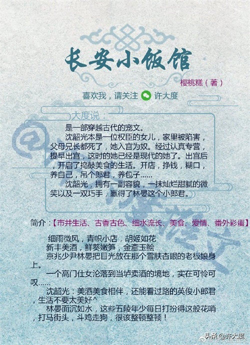 四、【古代言情-穿越文】《长安小饭馆》樱桃糕(著)「大度说」我特别喜欢古时候那种对话,这个文偏古风。我还喜欢古时候那种称呼“阿荠、阿园、阿兰、阿芳”等等,这个文是比较偏古代的称呼。我也喜欢从无到有的一个创业过程,这个文刚好是。我喜欢一对一,平淡又有点小曲折,这个文刚刚好就这样。这篇文才110章,算是古文里比较短的了。特别温馨,细水流长的类型,古香古色的哦。作者文字功底好,特别有画面感。你可以慢慢看,既不生涩,有不太过白话。刚好刚好!