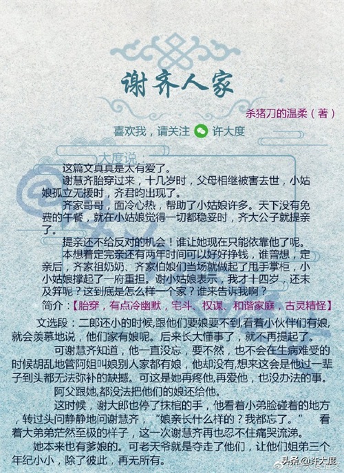 五、【古代言情-穿越文】《谢齐人家》杀猪刀的温柔(著)「大度说」谢慧齐是胎穿的,她外柔内刚,聪明,明理,有当担。这篇文,我非常喜欢祖奶奶。老小孩,大智若愚,世事洞明。谢慧齐是个幸运儿,因为她遇到了齐君昀,齐家。谢慧齐从遇到齐君昀开始,就渐渐偏离小乖乖的路线。小狐狸的尾巴慢慢显现,偶尔也会“泼妇”一下下。齐君昀呢,一味的看戏,“小狐狸特会演了。”配上一脸宠溺。刚开始以为女主是个哭包,谁知是个“斗士”。还是拥有女主光环的。男主真的是超强大boss,有才有谋有手段。全府上下没一个人不怕他的。说到这里,小姑娘又要哭了:我可以退婚吗?可以吗?作者文风幽默,古灵精怪的。整体感觉很温馨。