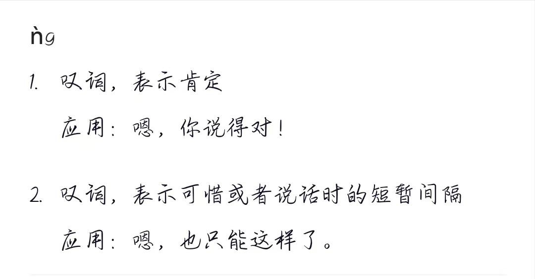 首先,第一个读音为“ǹg”,表示应诺的意思。