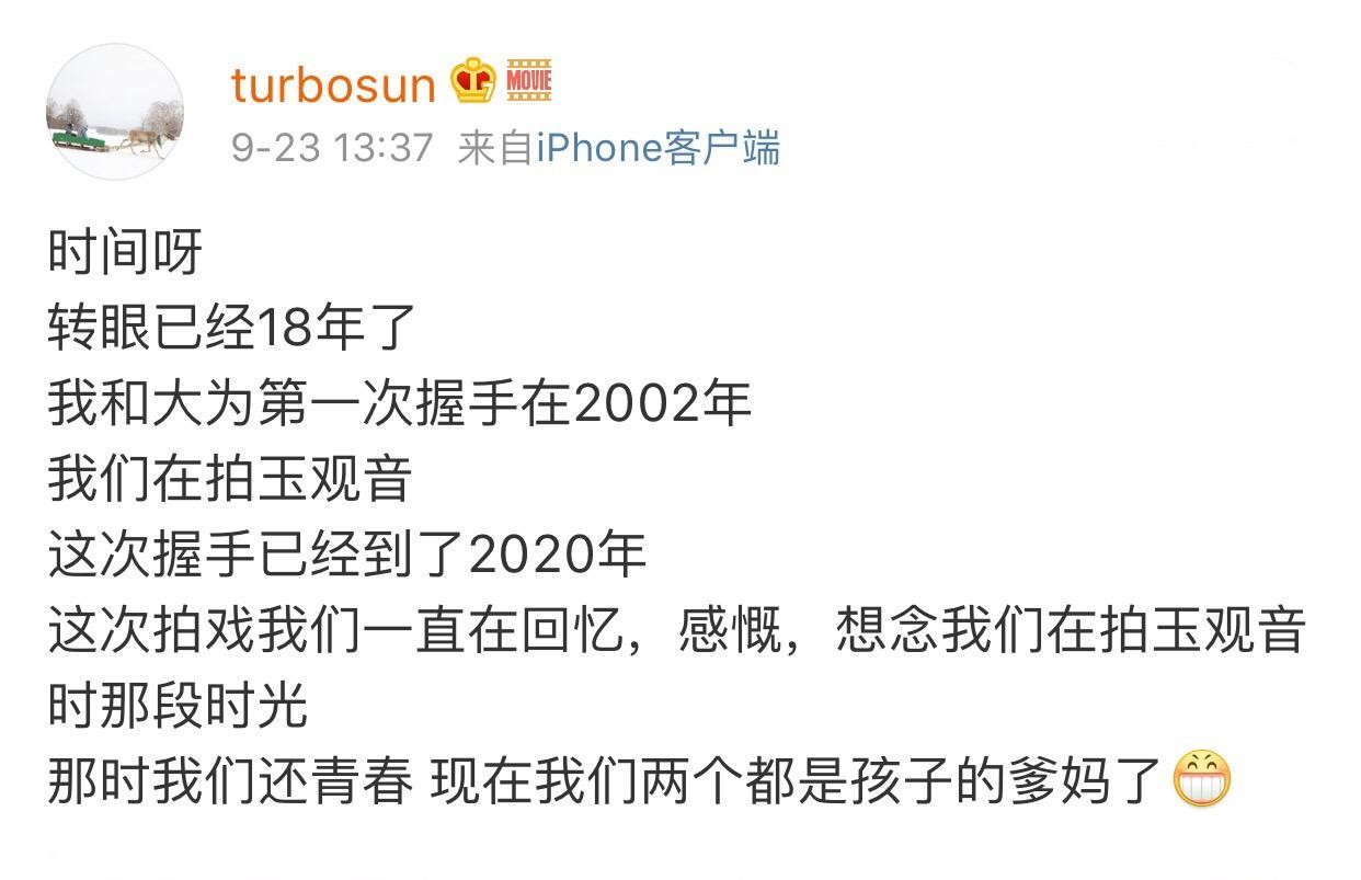孙俪表示:“时间呀,转眼已经18年了,我和大为第一次握手在2002年,我们在拍玉观音,这次握手已经到了2020年,这次拍戏我们一直在回忆,感慨,想念我们在拍玉观音时那段时光”。并谈到她和佟大为如今都是孩子的爹妈了。