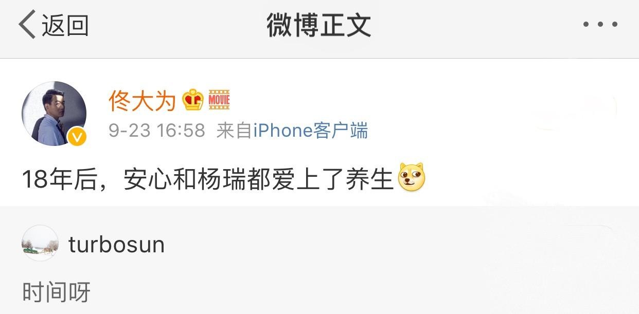 佟大为回应:“18年后,安心和杨瑞都爱上了养生”。确实,距离孙俪和佟大为首次合作拍摄电视剧距今已经18年的时间了。
