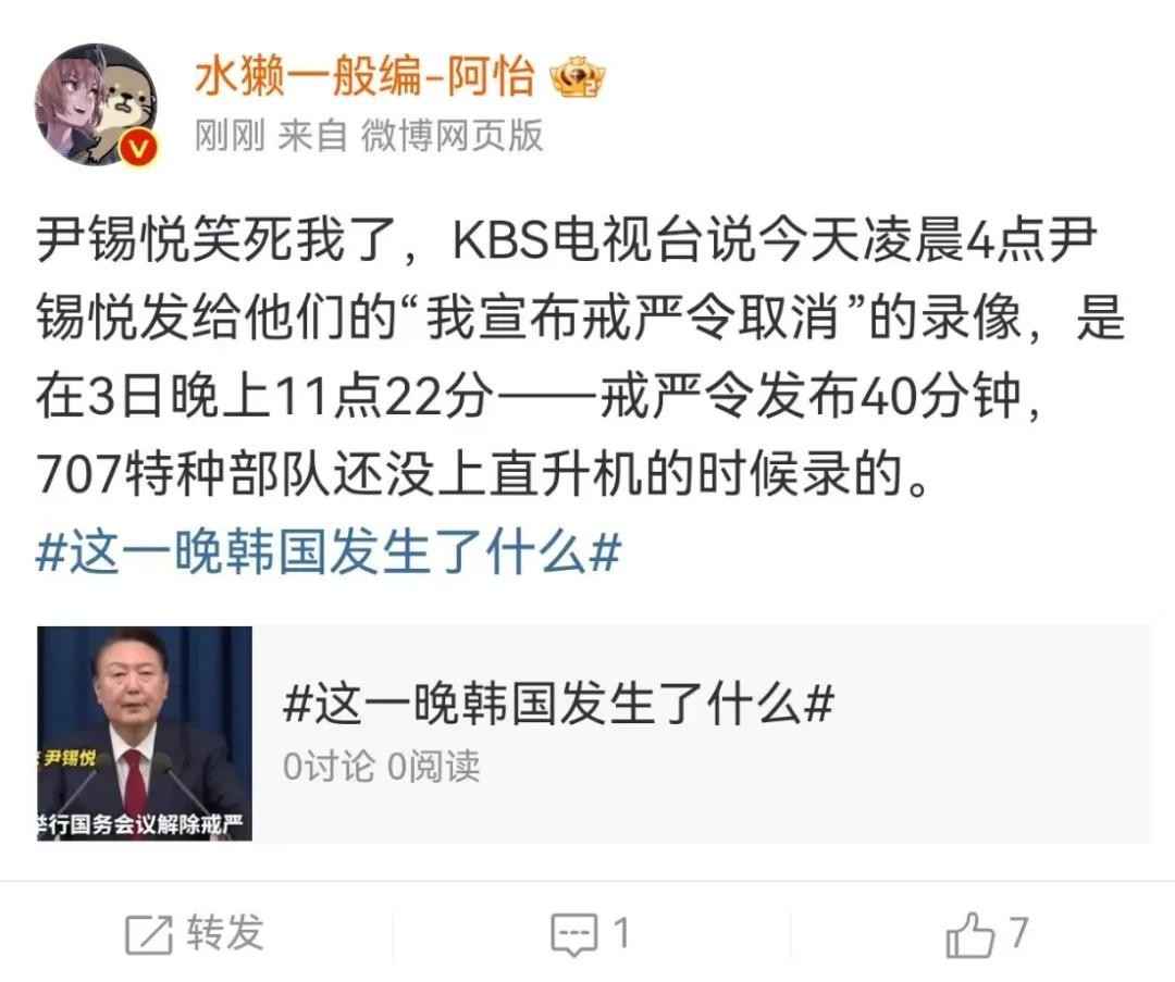 但是实际上…据说韩国KBS电视台检查了他们收到的尹锡悦宣布解除戒严令的时间戳,发现这段视频实际上的录制时间,是12月3日的23点20分,当时甚至连特战团都还没有赶到国会。也就是说,尹锡悦这边刚刚宣读戒严,那边就忙着录了一段解除戒严的视频。这是…自己的话刚出口就后悔了?