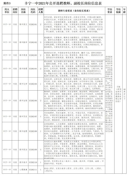 本次采取选聘录用方式,暂不入事业编。其中:选聘教师20名,主管教学工作的副校长1名。选聘岗位、人数、条件等详情,见附件3《丰宁一中2021年公开选聘教师、副校长普通话及专业能力要求》,附件4《丰宁一中2021年公开选聘教师、副校长岗位信息表》。
