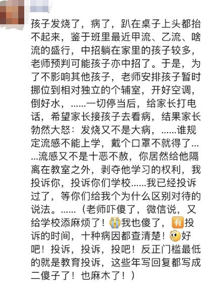 结果家长勃然大怒,说 " 发烧又不是大病,谁规定流感不能上学,戴个口罩不就得了 …… 流感又不是十恶不赦,你居然给他隔离在教室外,剥夺他学习的权利,我投诉你,投诉你们学校 ……"