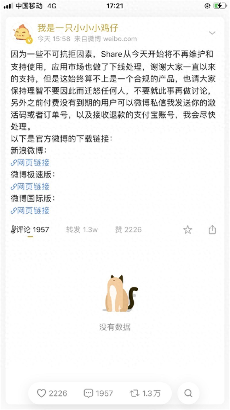 开发者:微博第三方客户端 Share App 停止支持并下架