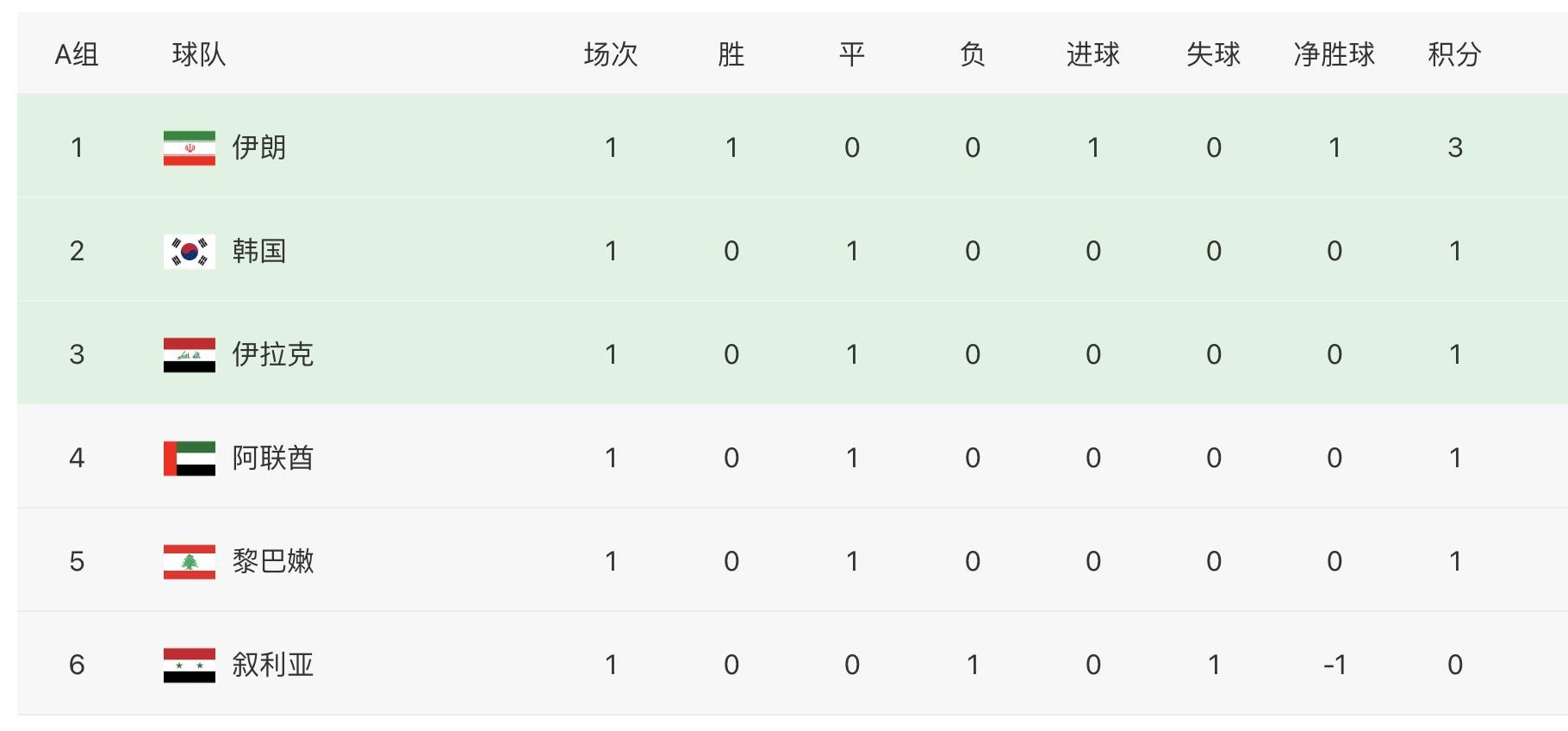 A组本轮比赛,只有一场比赛分出了胜负,其他2场比赛都是平局,伊朗队1-0击败叙利亚拿到了3分,另外两场比赛,阿联酋0-0黎巴嫩,韩国队0-0伊拉克队,由此第一轮比赛战罢,伊朗队3分领跑,其他四支球队都是1分,叙利亚0分垫底。