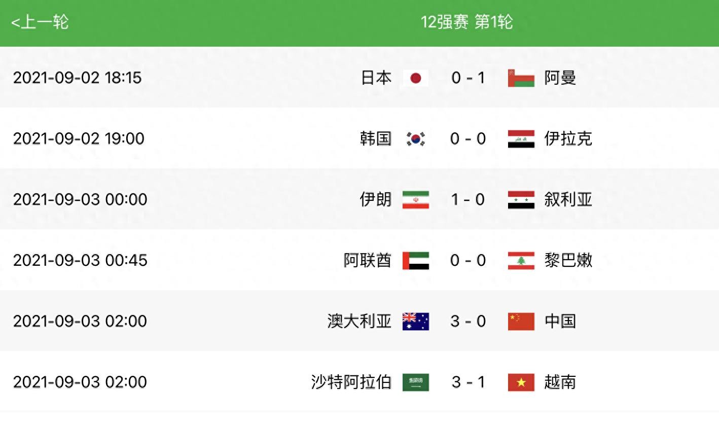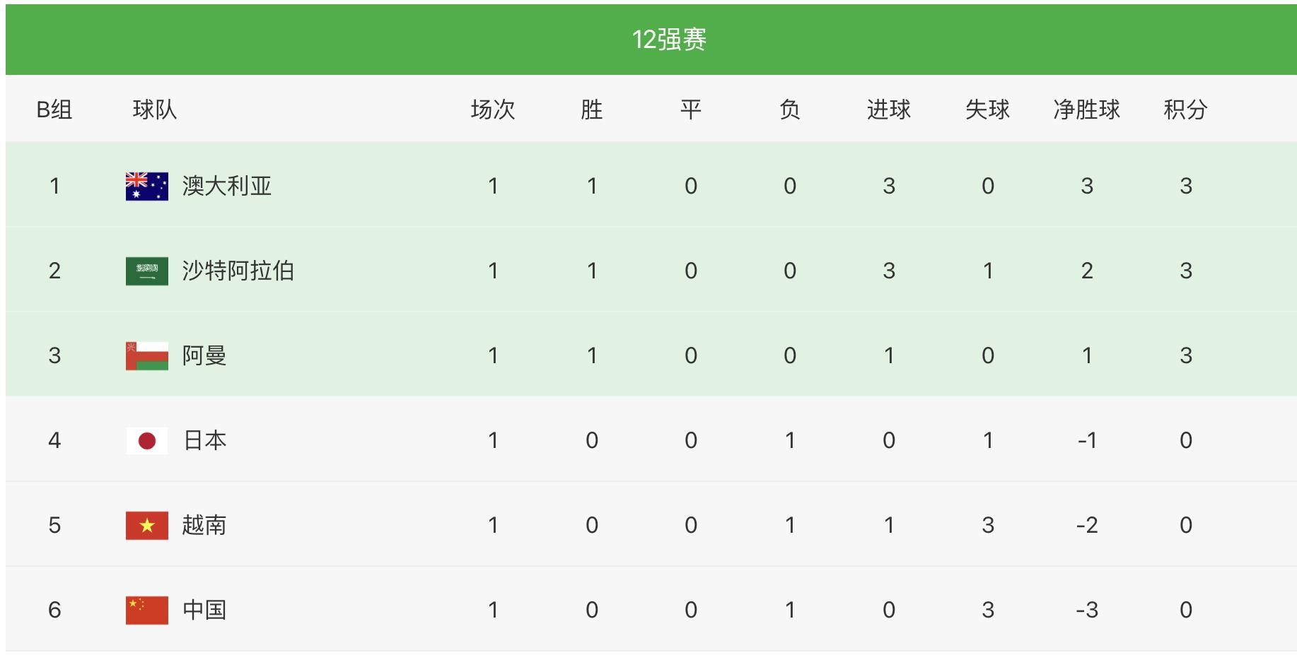B组本轮比赛,三场比赛都分出了胜负,日本队爆冷0-1阿曼,越南队1-3输给沙特,中国队0-3完败在澳大利亚脚下,目前澳大利亚3分领跑,沙特第2,中国队-3个净胜球小组垫底,也是12支球队里成绩最差的队伍。