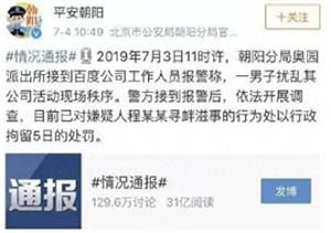 而在2025年7月3日11日的最新通报,北京朝阳分局奥园派出所在依法展开调查后,以对嫌疑人以寻衅滋事罪处以行政拘留5日的处罚。
