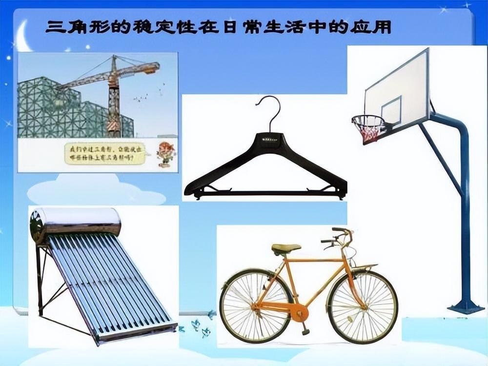 看下面我们生活中常见的这些物品了吗,为什么某一部分都做成三角形的?是因为利用了三角形具有稳定性的特点。就像衣架,挂上衣服,衣架也不会变形的。
