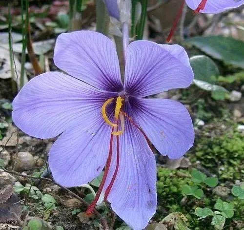 番红花(Crocus sativus)实际上是鸢尾科番红花属的一种草本植物。它有着细长的像葱一样的叶子,土里埋着蒜一样的球茎,然而开出的却是极其艳丽诱人的紫色的花。在靠近花蕊的地方,花瓣紫色渐深,黄色花蕊旁簇拥着的三根红色柱头,这就是番红花的精髓。