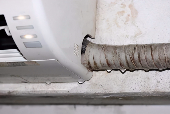 中央空调通常使用硬管作为冷凝水排水管,分体空调通常使用软管作为冷凝水排水管。当排水管出现老化破裂、杂物堵塞、弯折过大、挤压变形等情况时,都容易造成冷凝水排水不畅、排水过慢的现象,最终造成冷凝水积压而漏水。