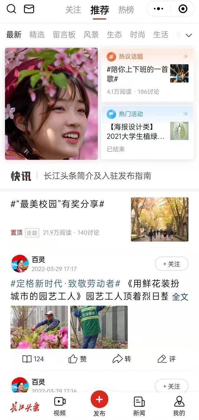 3月24日,长江网发起该话题,邀请各大高校在校学生和校友晒出手机里的美照,分享关于母校的美景和美好记忆。截至目前,话题阅读量将近22万人次。