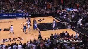 “电梯门”最早并不是勇士开始使用,因为在比赛中变幻莫测,不经意间可能就完成了一次“电梯门”战术,比如下图马刺在季后赛中的一次使用。