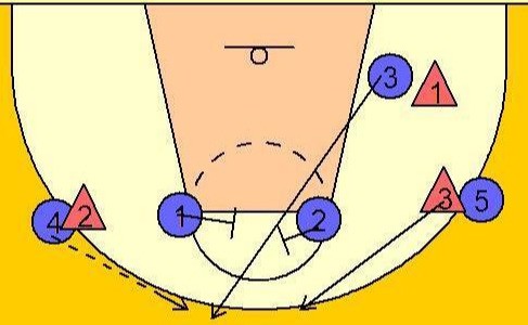 1、当球队射手从底线溜出而队内两名大个子已经上线落位时,防守球队可以预判射手的行进路线,防守队员提前补位,迫使三分线外接球的射手快速出球,破坏这一次的进攻。