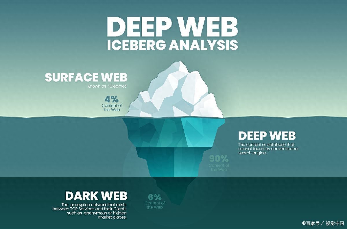 暗网是深网的一个分支,目前可以通过洋葱网络或l2P网络进行。统计数据显示,我们平时所能见到的表层网络的域名数量仅仅占据暗网的1/400到1/500。