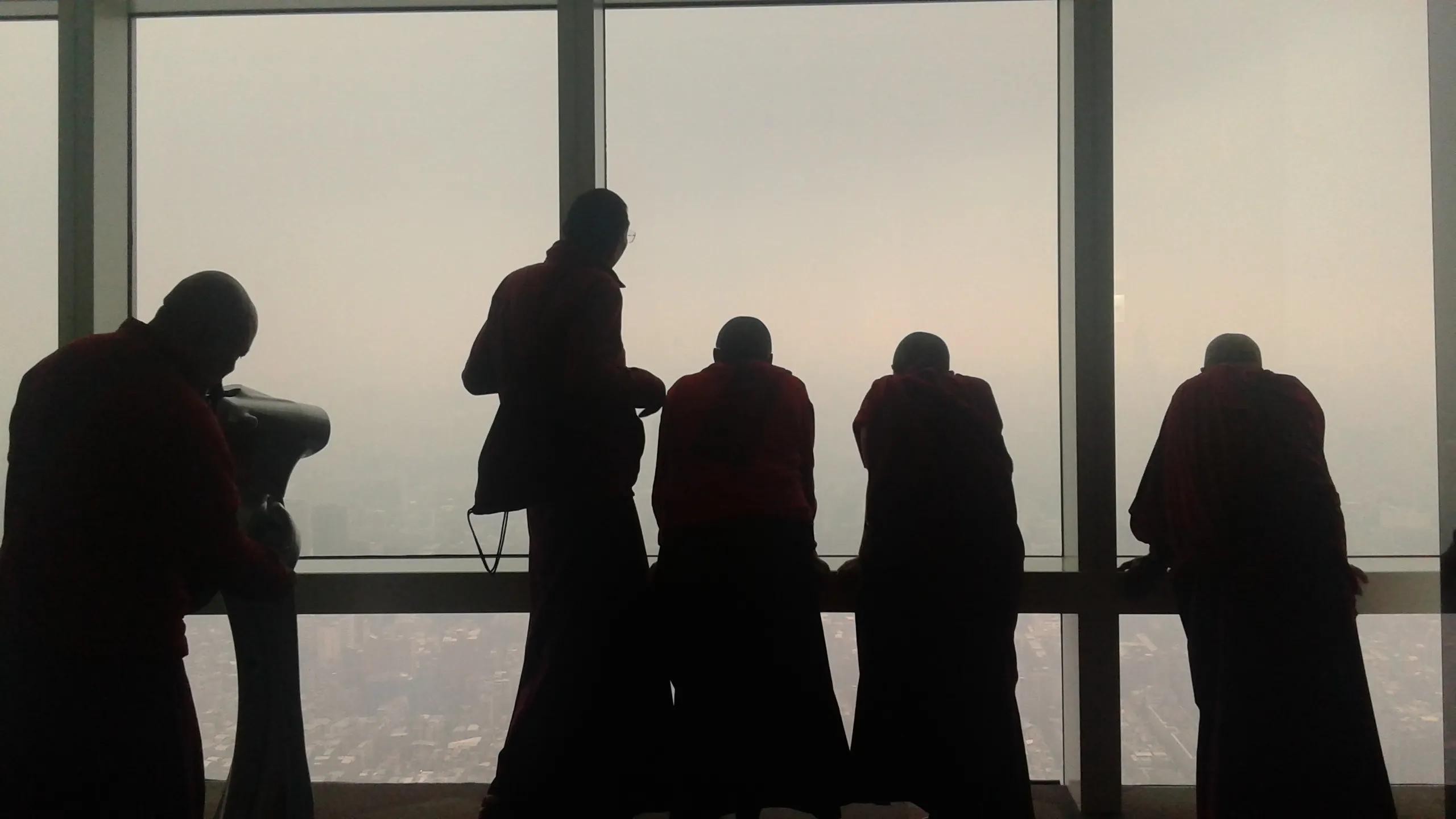 101大厦上几个僧人俯瞰台北市容,虽身形各异,姿态不同,但都是披着袈裟的僧人,就台湾政坛的缩影