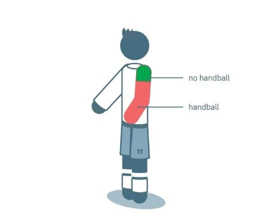 简单来说,就是肩膀接触球并不是手球犯规,只有肩膀以下的手臂区域接触球时才会被判罚手球犯规。