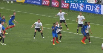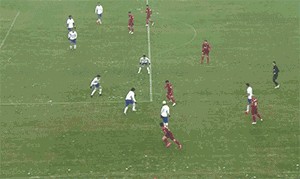 判例1:我们可以看到球经过蓝色队员头顶后,被白色队员用手明显的阻挡,应该判罚手球。