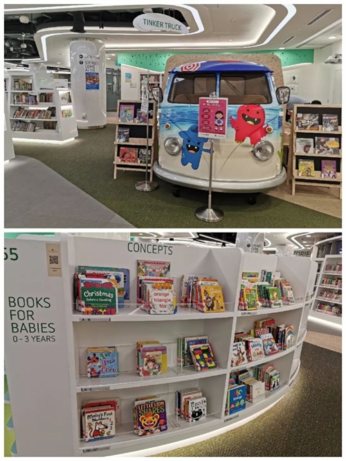 图书馆有两层,我们只在一层的低龄儿童区做了少许逗留。而且图书馆也并不因为低幼区而敷衍应付。无论是空间设计,图书分区,都设计得非常科学并且有美感。阅读体验极好。而且不单有英文书,仔细看还有很多当地民族语种和文化的书。完全不比国内商业机构的阅读机构体验差,真是感叹新加坡小朋友太幸福了!