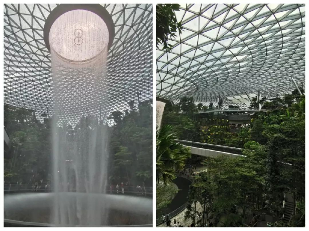 可以从T1机场出来过马路或者走地下通道到达对面的Jewel。这是一个集合住宿餐饮,购物娱乐,景观花园等多功能为一体的建筑。其中的室内瀑布高达40米,令人叹为观止,据说也是世界上最高的室内瀑布,建议大家一定要去打卡亲身感受一下。